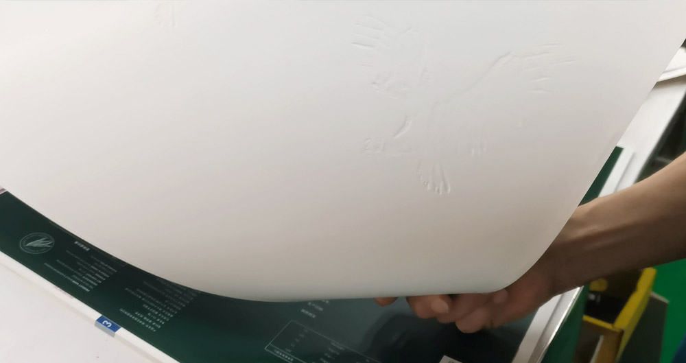 接下來講的是激凸工藝,激凸師傅將燙金OK的印刷品搬到激凸作業(yè)臺,使用凹凸版對印刷品施加壓力,使其產(chǎn)生立體效果,從而強(qiáng)調(diào)需要突出的部分,一般用在商標(biāo)、紙盒、煙包、禮盒等高端產(chǎn)品的裝潢上,提升消費(fèi)者對包裝產(chǎn)品的注意力。一般來說激凸會搭配燙金或UV,來提升印刷品的質(zhì)感。